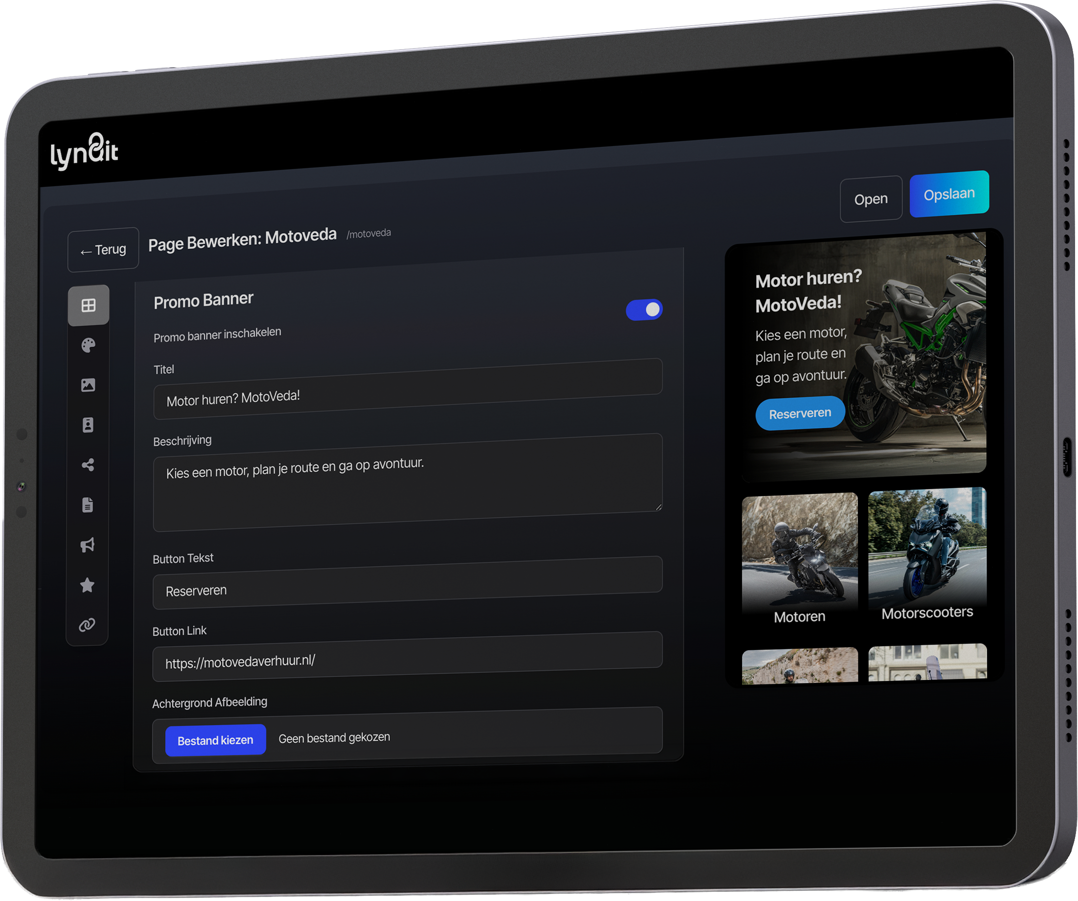 Geen developer nodig. Pas je links, teksten en afbeeldingen zelf aan in een overzichtelijk dashboard. Ideaal voor marketeers en contentbeheerders die snel willen schakelen.